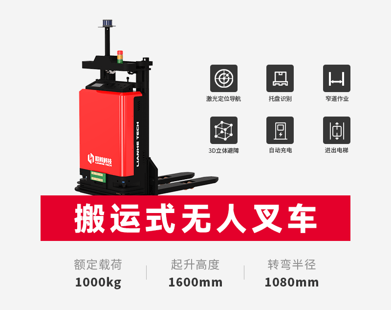 搬运式无人叉车CDD010-SA专为窄道设计,超薄车身,可满足负载1吨、举升1.6米的作业需求,同时搭载激光导航以及多传感器融合的安全避障系统,安全、高效、自动完成各类搬运任务。